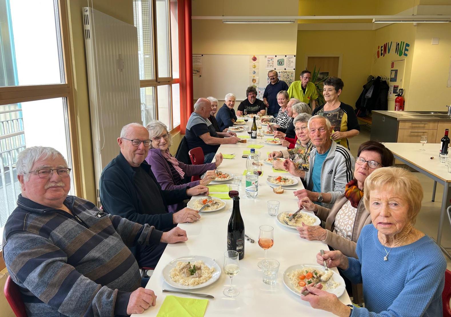 Rejoints par les autres participants pour un coup de main final, nous partageons un apéro bien mérité, puis nous dégustons, dans une ambiance conviviale et joyeuse, le repas nous rappelant bien des souvenirs. Il se raconte des anecdotes, des souvenirs et des gags en tout genre ; bref, c’est un moment de bonheur.
